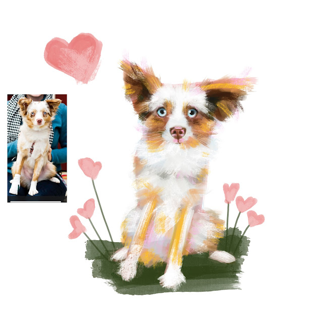 I’m super excited to offer these unique pet portraits for sale in my Etsy shop real soon. This is one look of pet portraits that I’m interested in creating for my dog moms and cat moms! (The second option will be a peeking pet that is more painterly and involved) this first option is a full body on a pad of grass and flowers to match the palette. It’s a simple yet stylized look of cats or dogs.